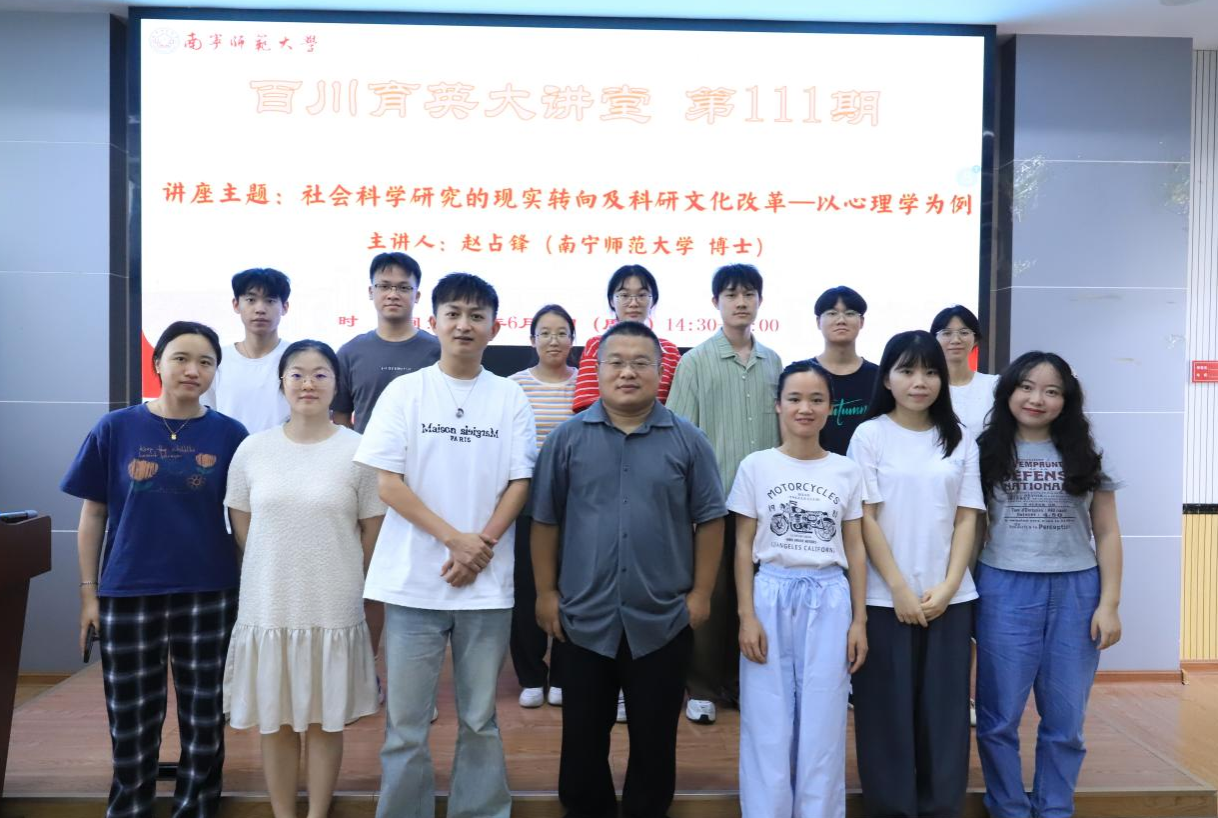 主办、广西教育现代化质量检测研究中心承办的《百川育英大讲堂》第111期讲座在五合校区理综楼1003室顺利举行。本次讲座以“社会科学研究的现实转向及科研文化改革——以心理学为例”为主题,由南宁师范大学教科院心理学系副系主任、副教授、硕士研究生导师赵占锋博士主讲。