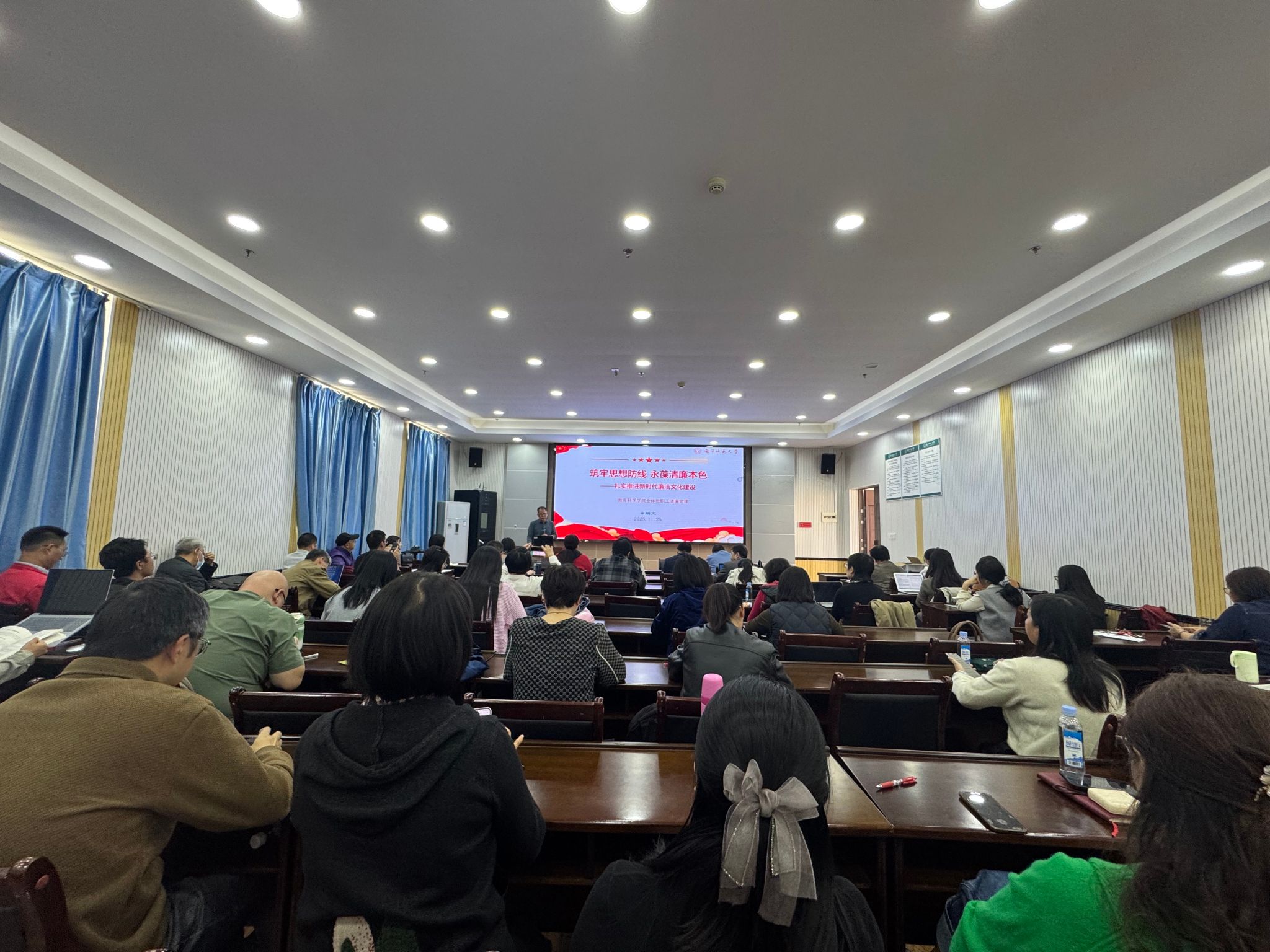 针对高校易发风险,党课梳理了经费管理不规范、学术不端、“四风”隐形变异等问题,提醒教师时刻绷紧廉洁之弦。“筑牢思想防线要从理论武装、党性锤炼、文化涵养、家风建设四方面发力。”余书记指出,教职工需持续学习党的创新理论,用好批评和自我批评武器,并以中华优秀廉洁文化、红色基因为滋养,营造崇廉尚洁的校园氛围。同时,学院将压实全面从严治党主体责任,完善制度体系、强化日常监督,以“零容忍”态度严肃执纪问责,推动清廉建设落地见效。