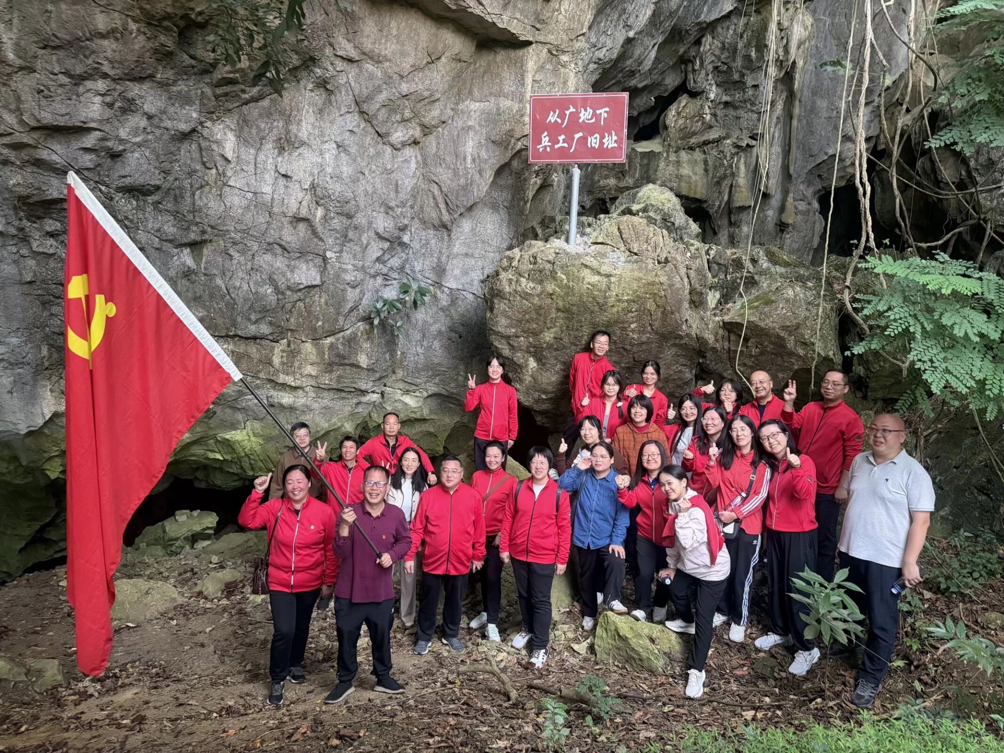 在夏黄村小学红色小广场,全体党员面向党旗,举起右拳,庄严宣誓,重温入党时的铮铮誓言。随后,大家开展红色朗诵活动,激昂的语调、真挚的情感,抒发了对党的忠诚与热爱;在民族团结墙前,大家共同合影留念,彰显各民族同心向党、团结奋进的良好风貌;伴随着嘹亮的旋律,全体人员同唱红歌《强军战歌》,歌声回荡在广场上空,传递着对党的感恩与赞颂。最后,大家前往从广村地下兵工厂旧址参观。作为武鸣区唯一的地下兵工厂兼地下联络站,讲解员详细介绍了地下兵工厂的组建背景、运作模式以及在革命斗争中发挥的重要作用,让大家对革命先辈的智慧与勇气深感敬佩。