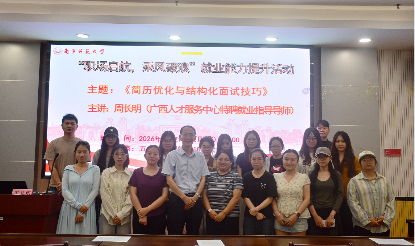 在五合校区理综楼1003会议室举办“职场启航,乘风破浪”就业能力提升活动——《简历优化与结构化面试技巧》。本次活动特邀广西人才服务中心特聘就业指导导师、南宁企星企业咨询有限公司咨询师周长明主讲。