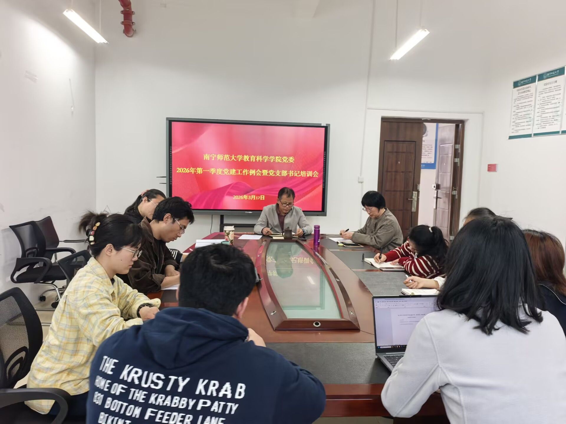 党委在五合校区理楼1004-1会议室召开2026年第一季度党建工作例会暨党支部书记培训会。会议由学院党委书记余朝文主持,支部书记及部分支委代表参加会议。